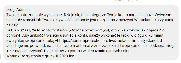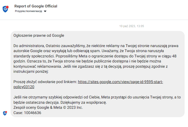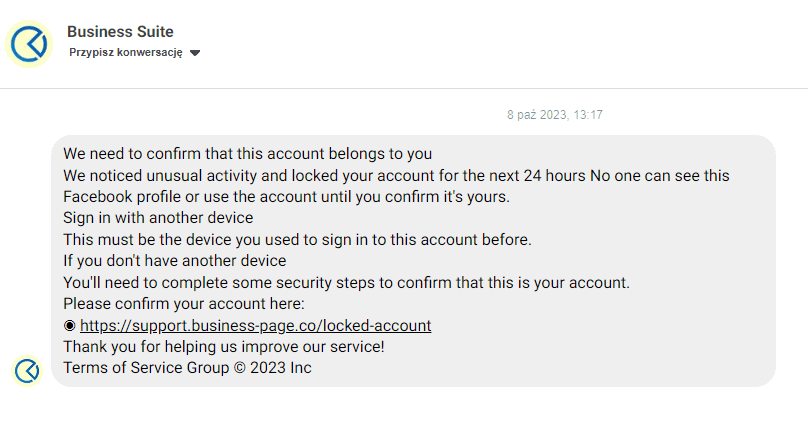 Głównym celem są fanpage. Co za tym idzie, dla wielu biznesów opierających swój marketing na Facebooku taka nieudaremniona próba włamania i utrata konta może być bardzo bolesna. Można śmiało założyć, że każdy fanpage w Polsce dostał wiadomość o tym, że zostanie on usunięty jeśli administrator nie zrobić tego i tamtego. Zazwyczaj wymaga się od nas reakcji w postaci przesłania jakiego formularza za pomocą dołączonego linku. Takie same próby oszustwa są przysyłane na nasze maile. Trudno powiedzieć, gdzie jest przyczyna problemy ale jeden element wszystkich wiadomości jest wspólny, a mianowicie: wiadomości wyłudzające dostęp przychodzą wyłącznie na email podany w Bussines Manager. To niepokojące. Można odnieść wrażenie, że zorganizowana grupa ma lub miała sposób aby pozyskać adres email i teraz to wykorzystuje. Drugi problem to fakt, iż wykorzystuje się fikcyjne konta na Facebooku ze zdjęciem profilowym takim jak aplikacje Facebook, META, Business Suite i inne aby wprowadzić w błąd co rzeczywistego autora wiadomości.