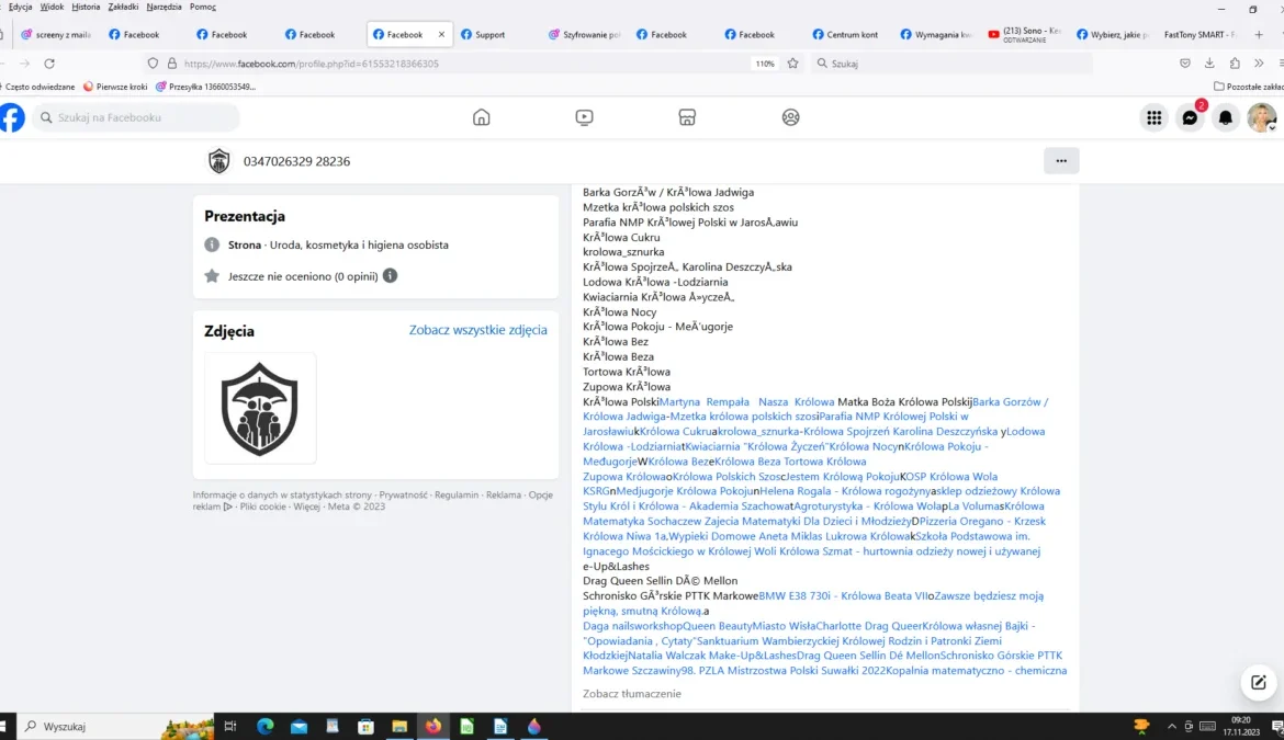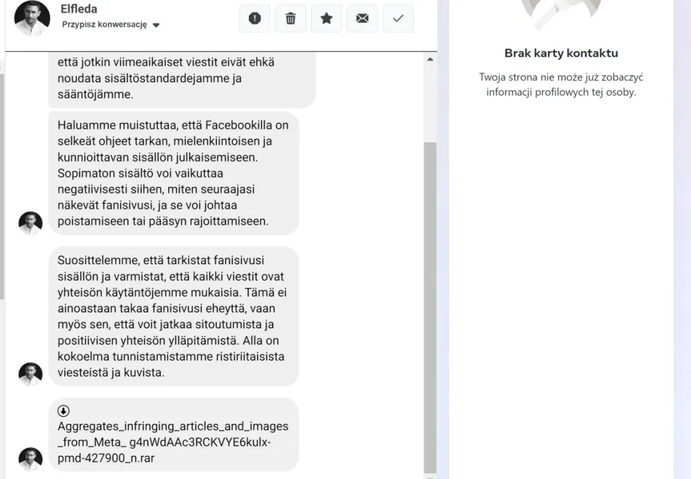 Jak widać fikcyjne konta zostało tak spreparowane że uszkadza funkcje Facebooka że nie można po prawej stronie NIC przeczytać i jest tylko BRAK KARTY KONTAKTU