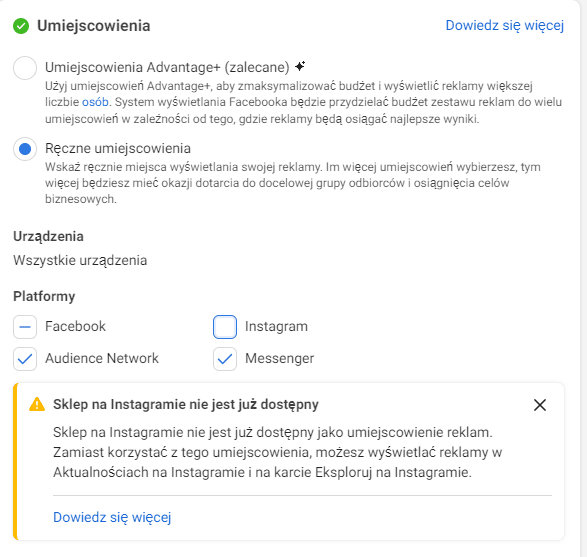 Wchodzimy w menedżera reklam i edytujemy wybraną kampanię, następnie zmieniamy umiejscowienie na ręczne i wykluczamy IG. Jak na poniższych screenach. Po czym klikamy – OPUBLIKUJ REKLAMĘ. I w tej chwili to jedyne rozwiązanie. Miejmy nadzieje, że błąd zostanie szybko naprawiony.