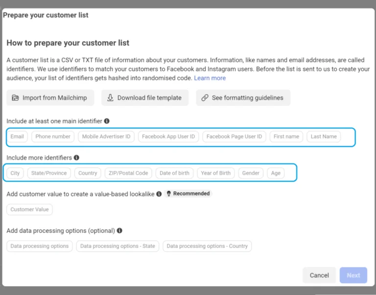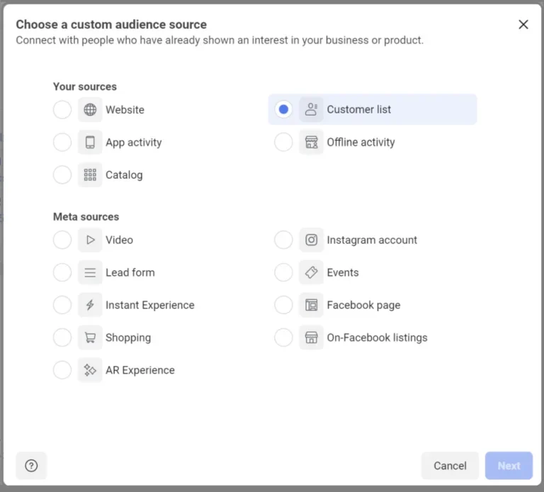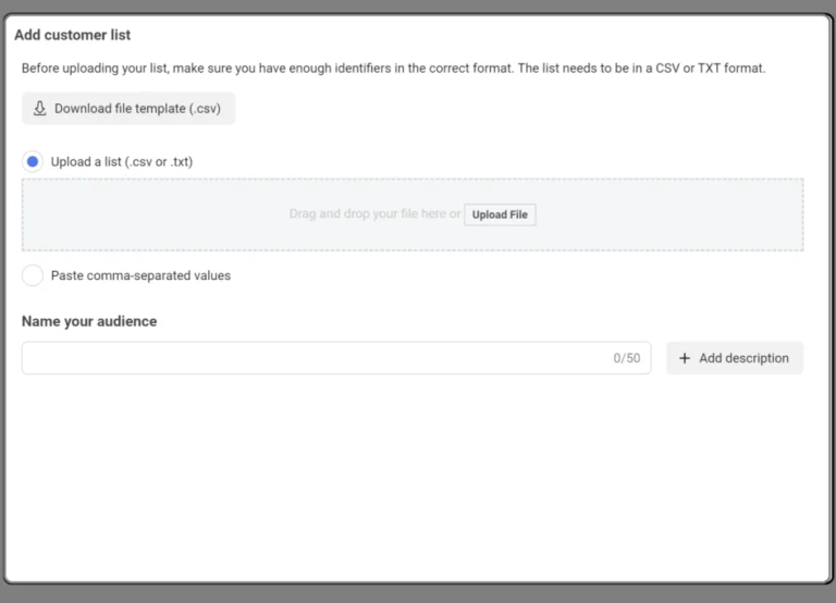 - Import danych do Ads Managera: Po uzyskaniu dostępu do danych, możesz je zaimportować do Ads Managera na Facebooku. Taki zbiór nazywamy „Custom Audience”.